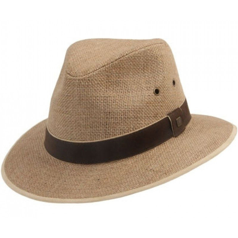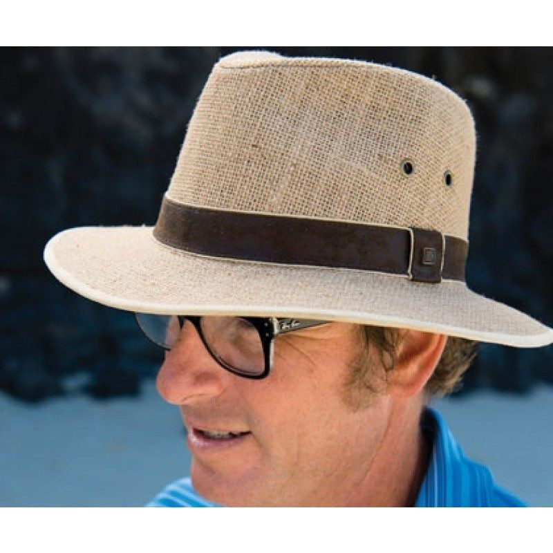 Snappy drover with a stand out leather crown band.Design FeaturesCrown Band - Faux LeatherMetal EyeletsMetal Logo TrimInternal FeaturesCotton SweatbandFaux Leather - Forehead PatchLining - Poly MeshFabric100% LinenLining100% Polyester