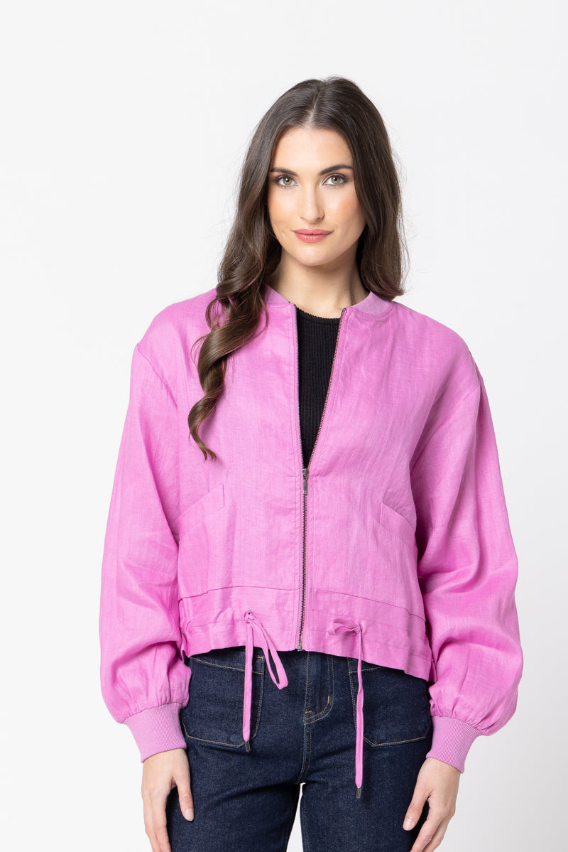 Bomber style jacket with adjustable drawstring waist, and ribbed cuffs.