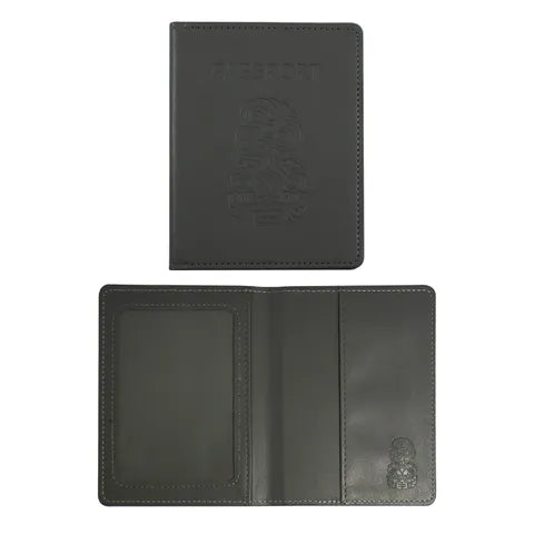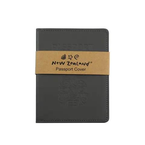 A stylish grey passport holder featuring an embossed tiki design. The perfect travel staple to keep your passport safe. Size: 14cm H x 10.25cm W (folded)